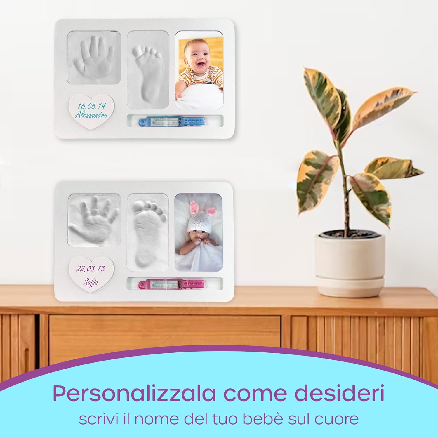 Crea ricordi magici con il calco mani e piedi neonato! Il kit nascita neonato include una cornice speciale con l’impronta del tuo piccolo. Un’emozionante esperienza creativa e un tesoro di affetto che durerà per sempre. Cornice con impronta neonato è la scelta sicura per il regalo perfetto!