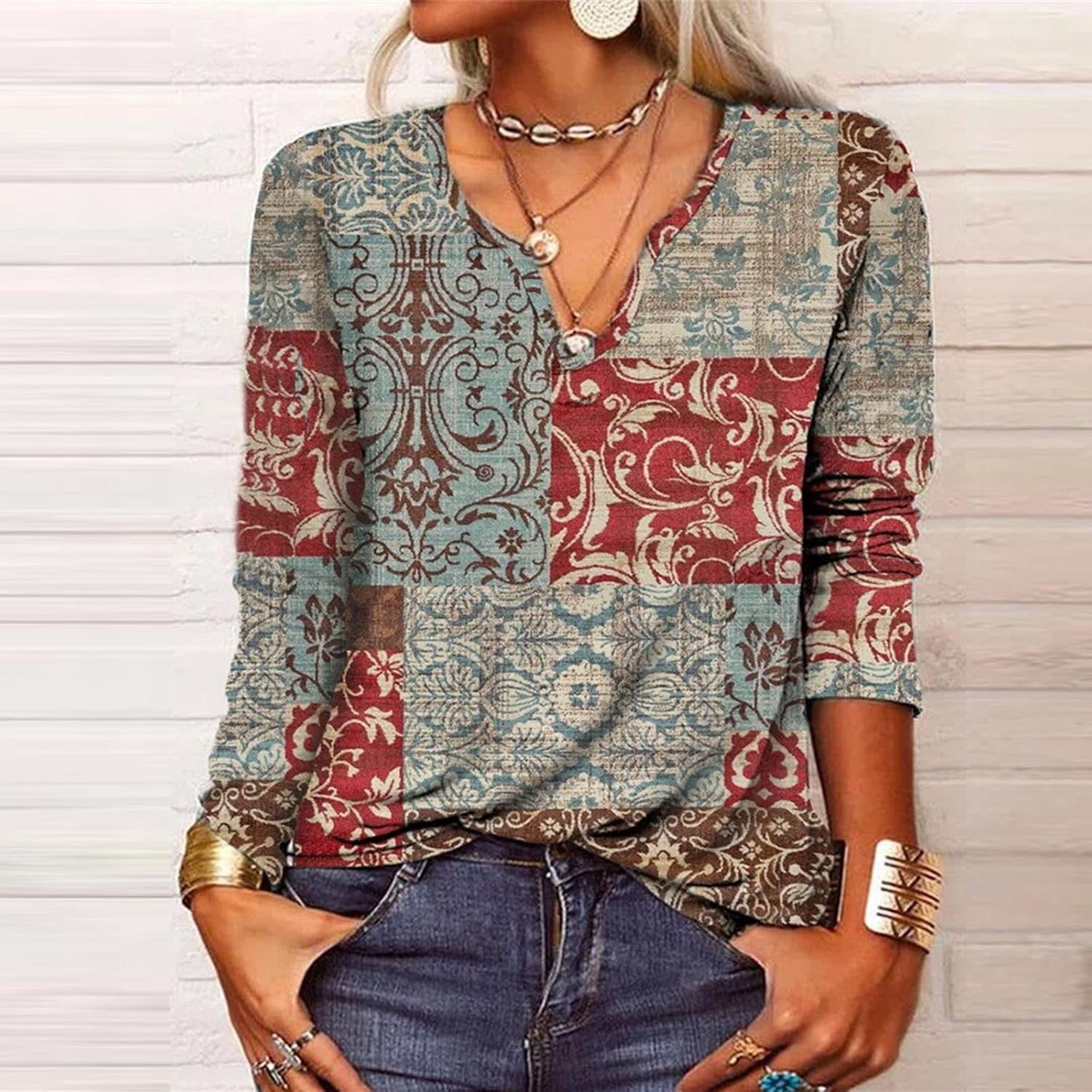 Tops Donna Manica Lunga Lavoro Primavera Camicette Bellissimo Taglia Grossa Stampa Blusa Adatto Henley Comfort